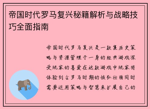 《帝国时代:罗马复兴》是一款集历史、策略与资源管理于一身的经典游戏,深受玩家的喜爱。在这款游戏中,玩家将体验到古罗马时期的恢弘壮丽,同时需要运用策略与智慧来扩展自己的帝国。本文将从四个方面详细解析《帝国时代:罗马复兴》的秘籍和战略技巧,帮助玩家更好地掌握游戏技巧,从而在战斗中占据优势。这四个方面分别是:掌握资源管理与经济建设、合理运用军队布局与战术、优化科技树研究与升级、巧妙使用游戏秘籍与隐藏要素。通过这些策略和技巧的讲解,玩家将能够更加深入地理解游戏的核心机制,提升自己的游戏水平,成为一位真正的罗马帝国领主。